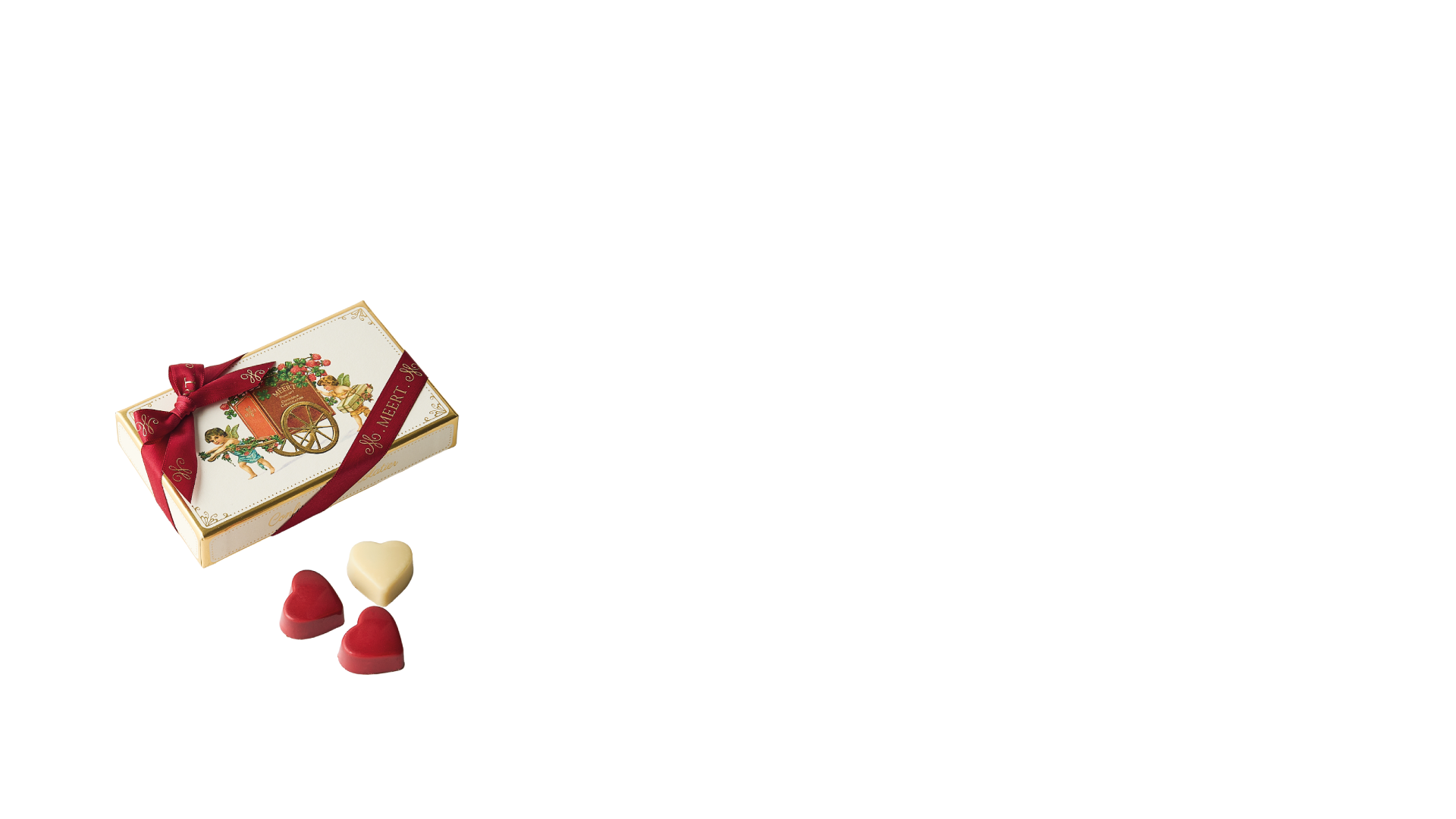 Chocolate hearts : 6 white hearts (almond praliné) et 6 red hearts (passionfruit ganache).