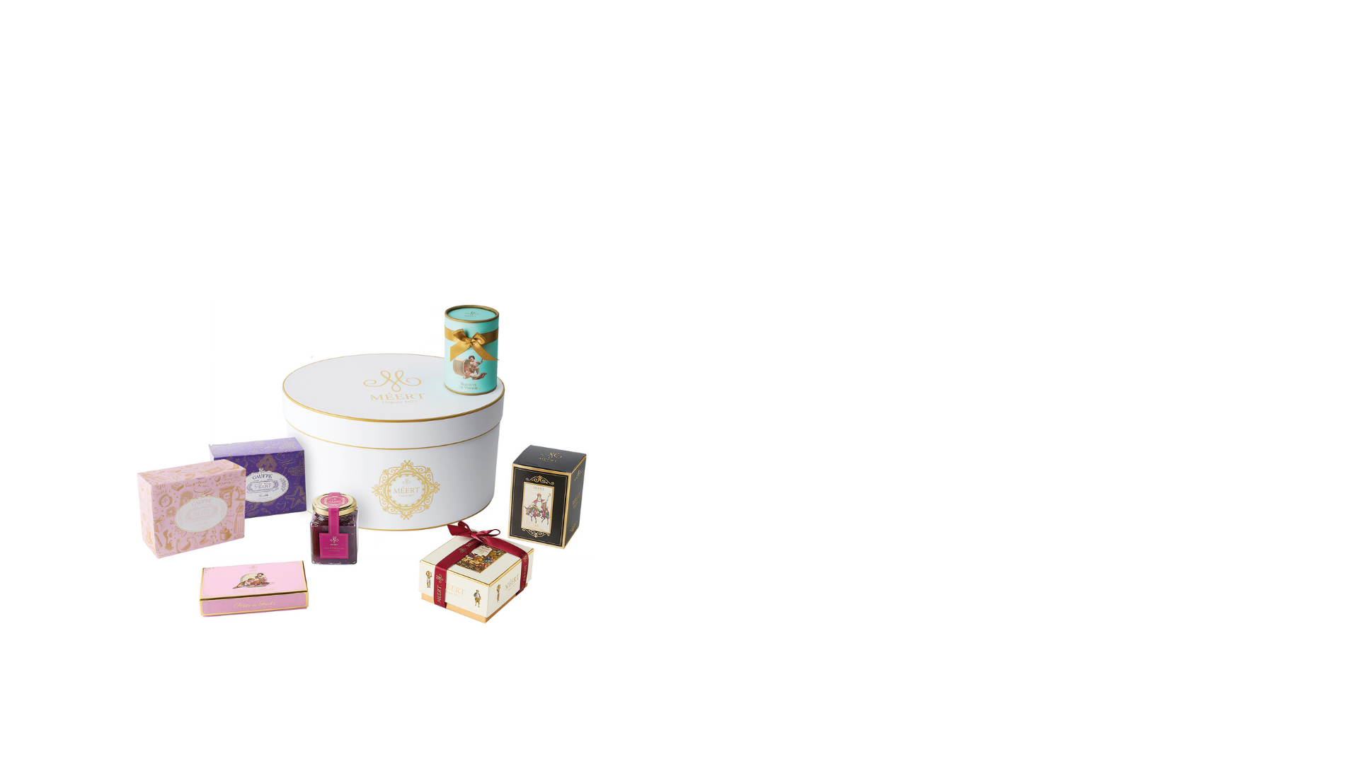 1 box of 12 vanilla waffles, 1 box of Saint Nicholas tea (100 g), 1 small box of pink pralines, 1 small box of orangettes, 1 box of fruit pastes, 1 jar of strawberry jam (275 g)