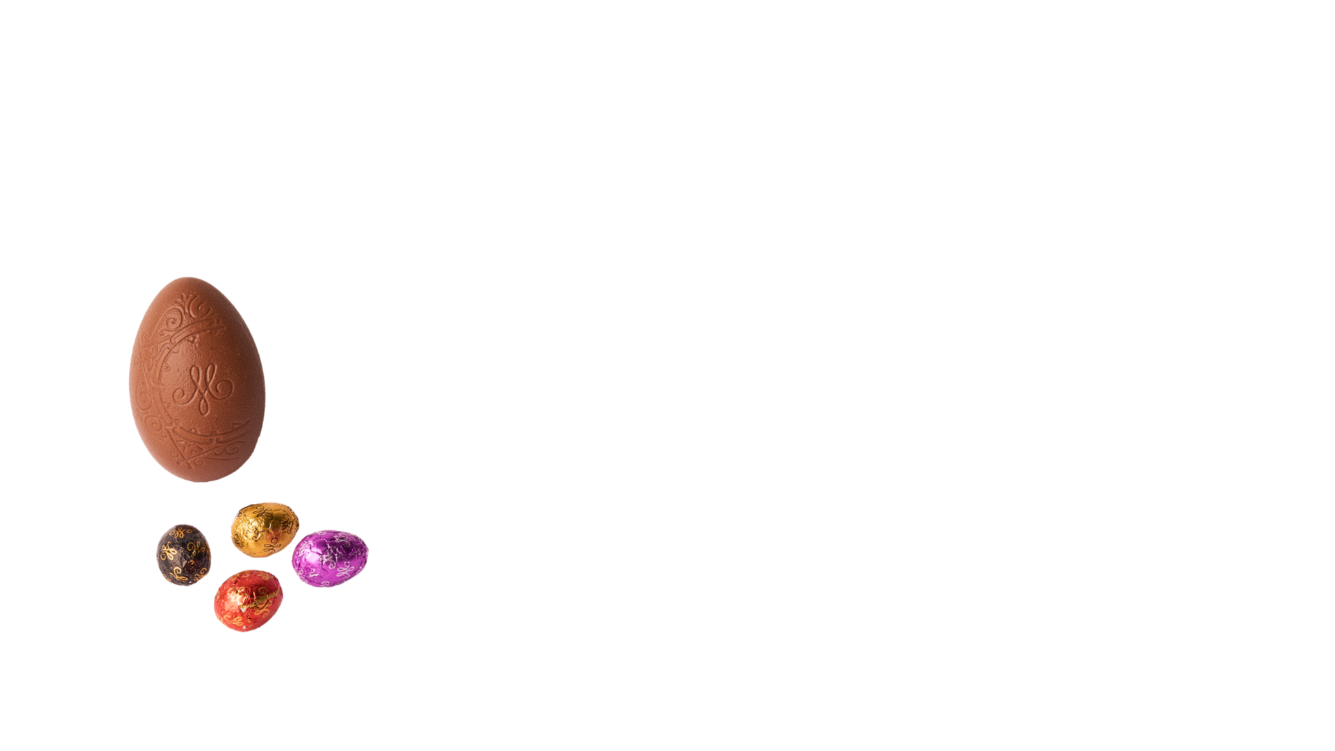 Œuf de Pâques en chocolat au lait garni d'un assortiment de petits oeufs (chocolat noir, au lait et blanc).